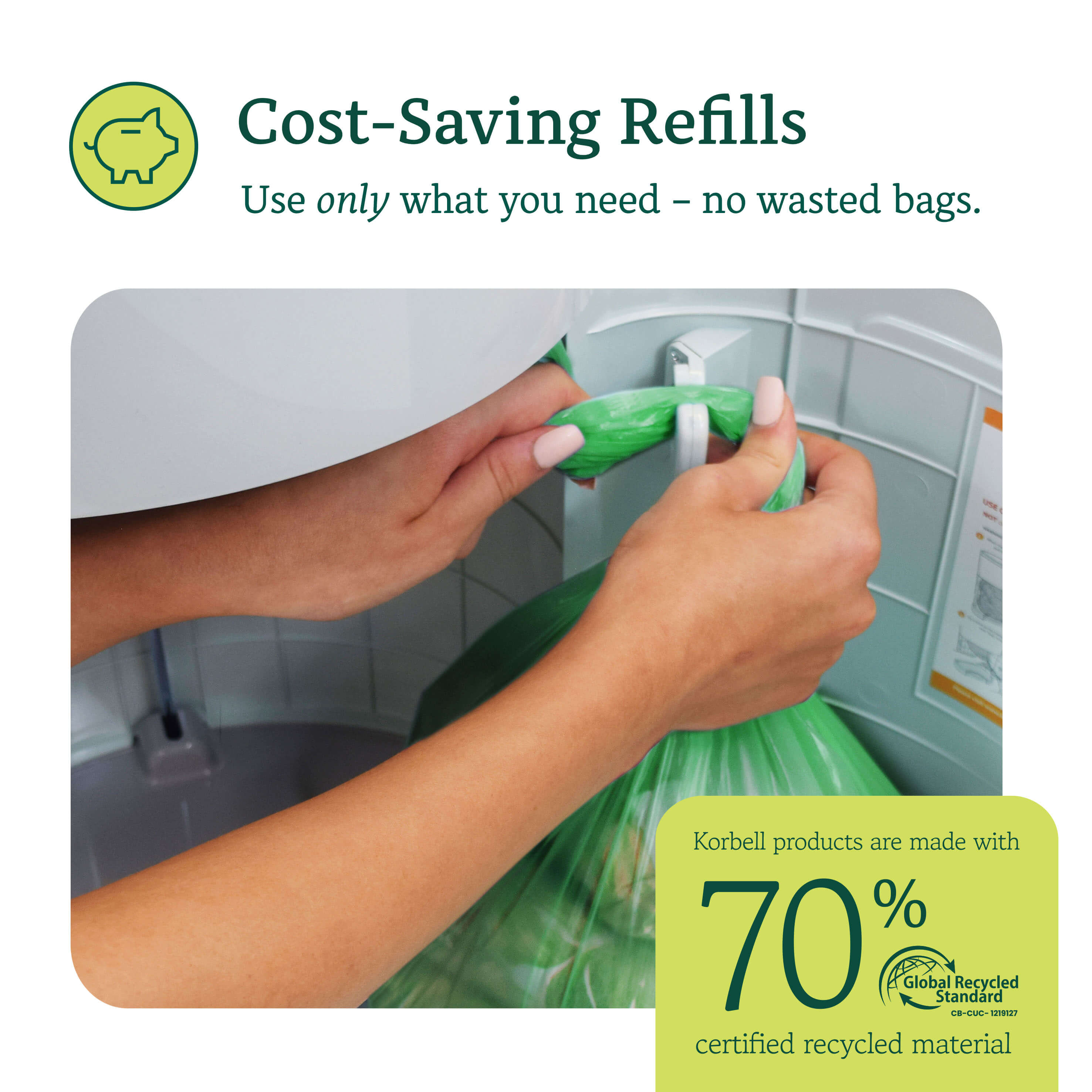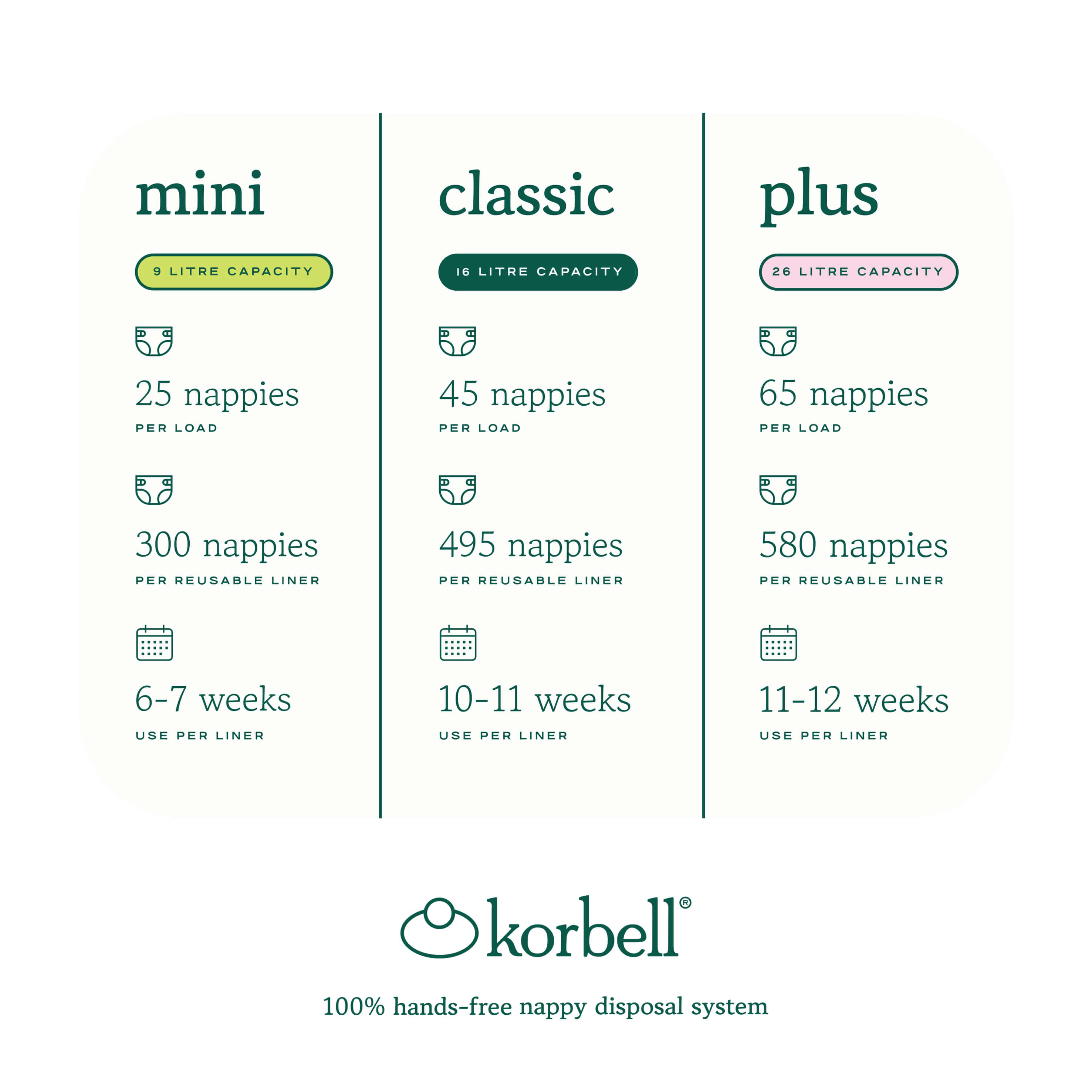 Korbell Plus 26 Litre Nappy Bin - Holds up to 65 nappies at a time and the liners last for up to 580 nappies or 17-18 weeks.