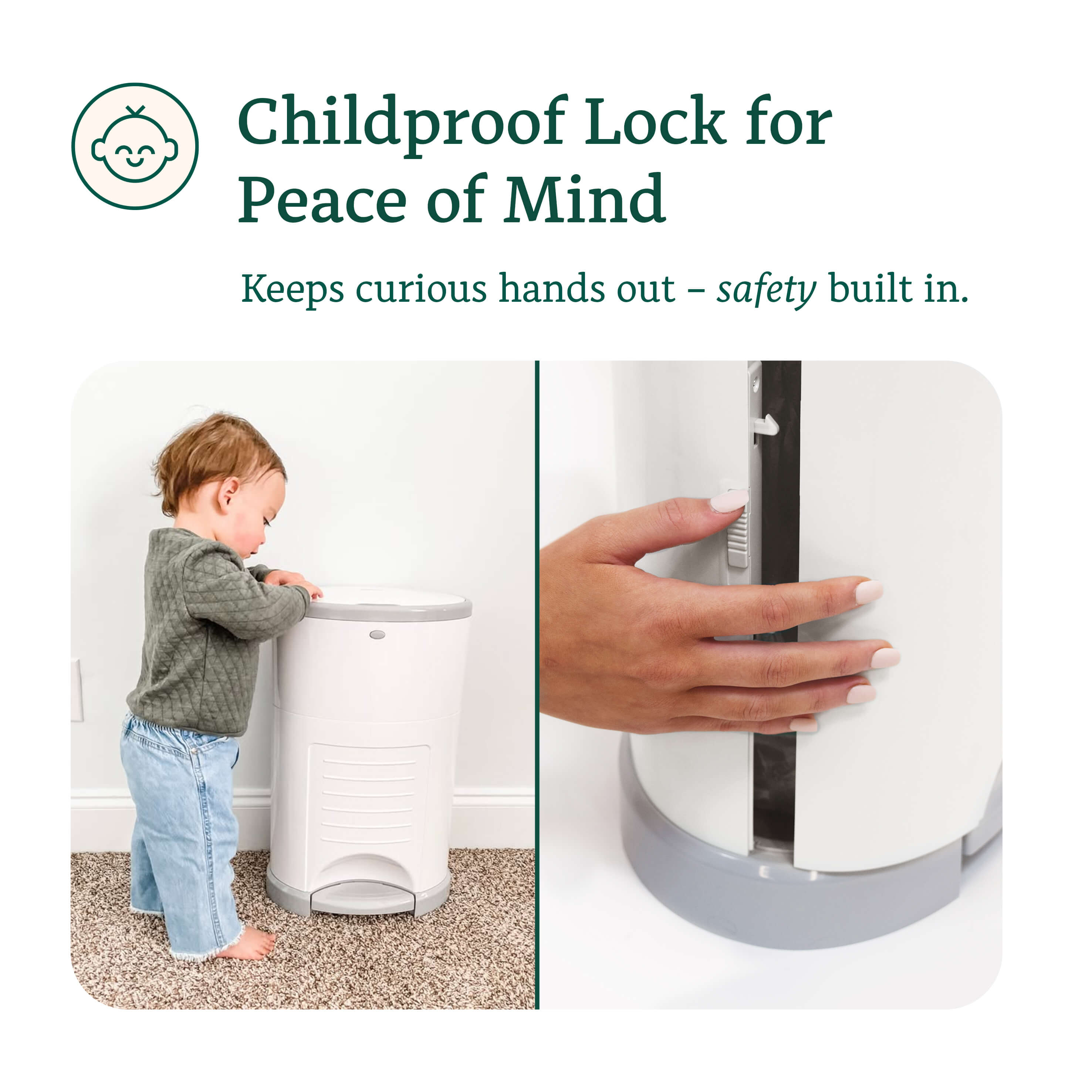 • Unique three-part approach locks in odours to keep your nursery feeling fresh – a sealed spring-loaded door that immediately shuts; a top lid that when shuts acts as a secondary seal; and