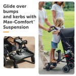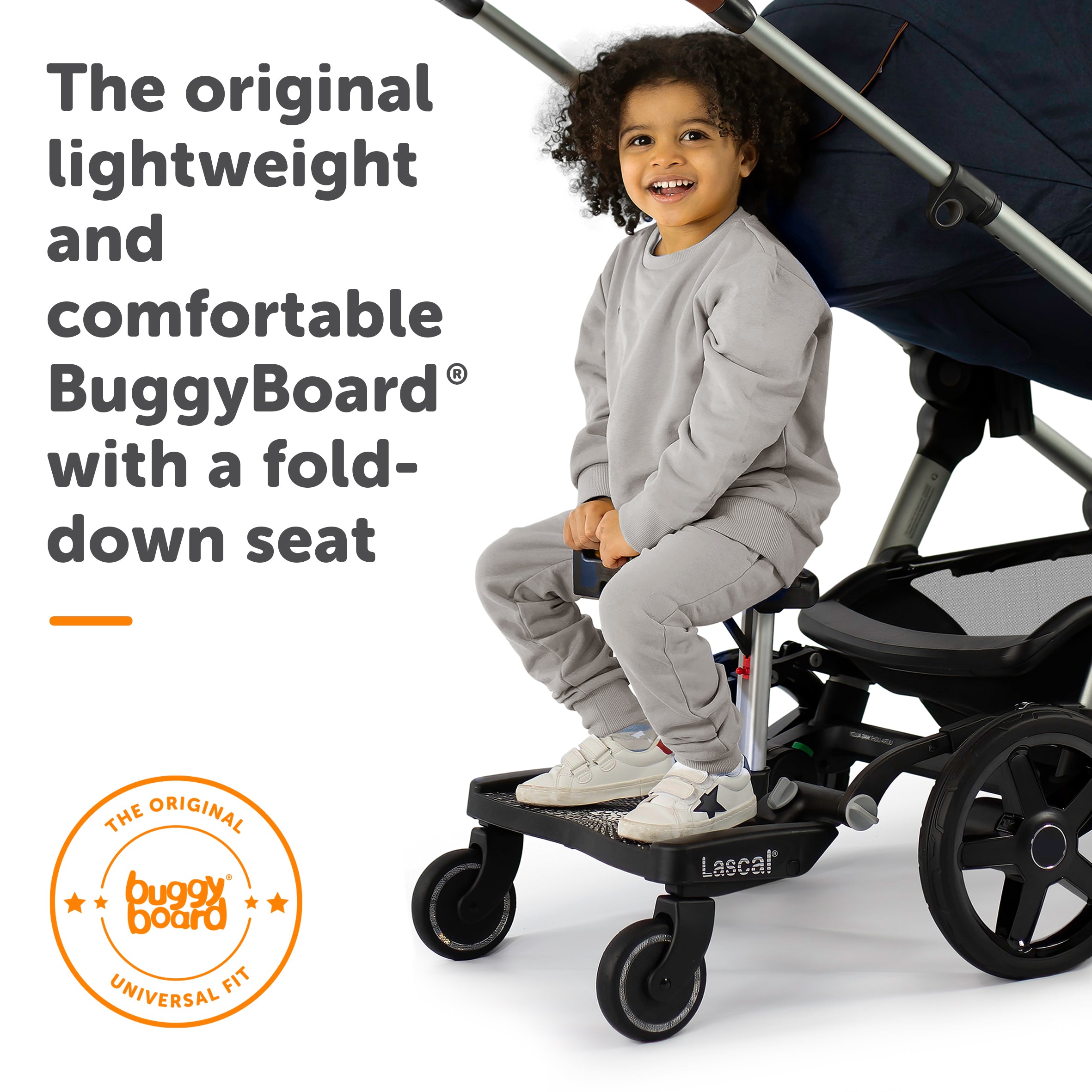 BuggyBoard® Maxi Plus is the top-of-the-range board, featuring a large platform, reflective wheels, and built in saddle seat. Fits between uprights 31-54 cm.
