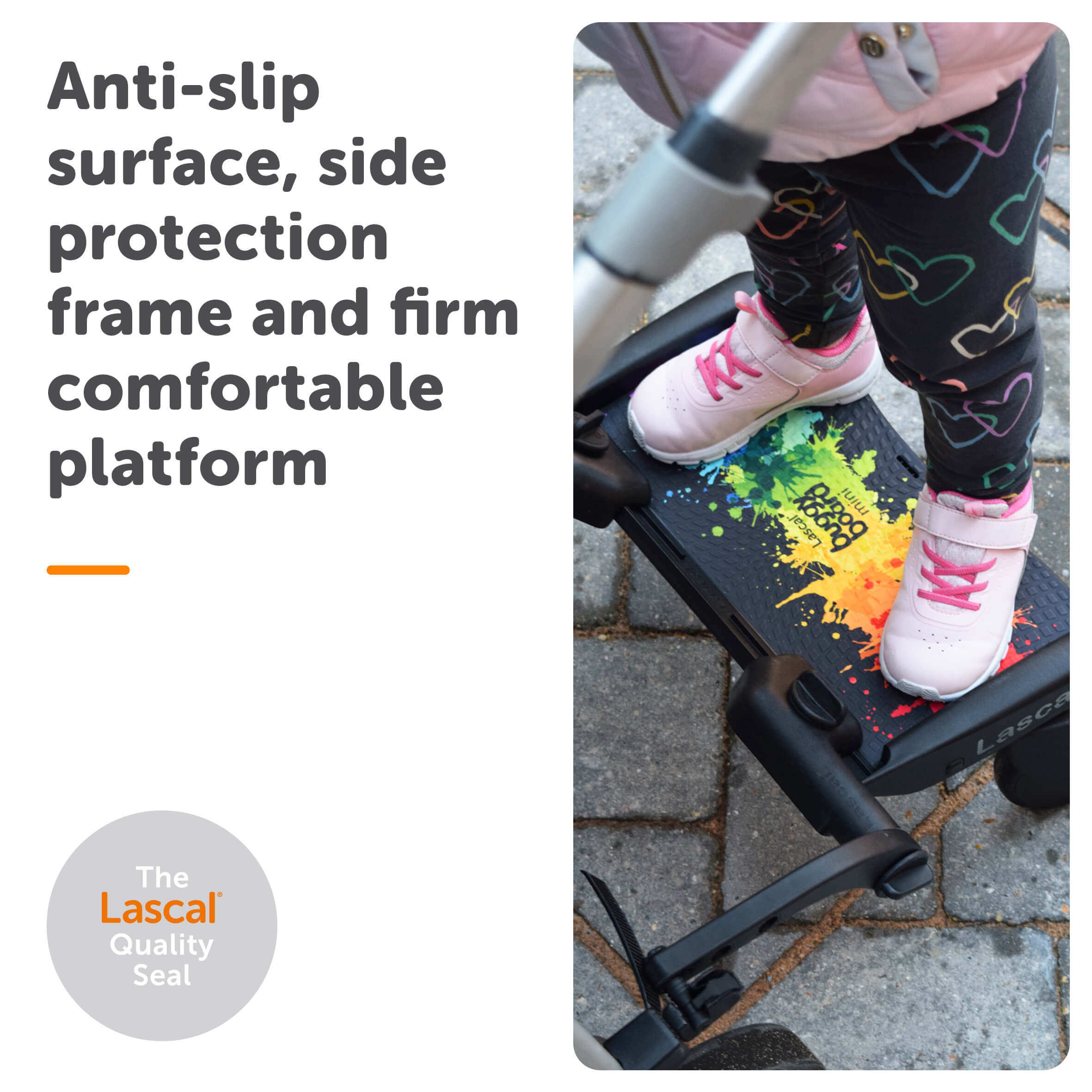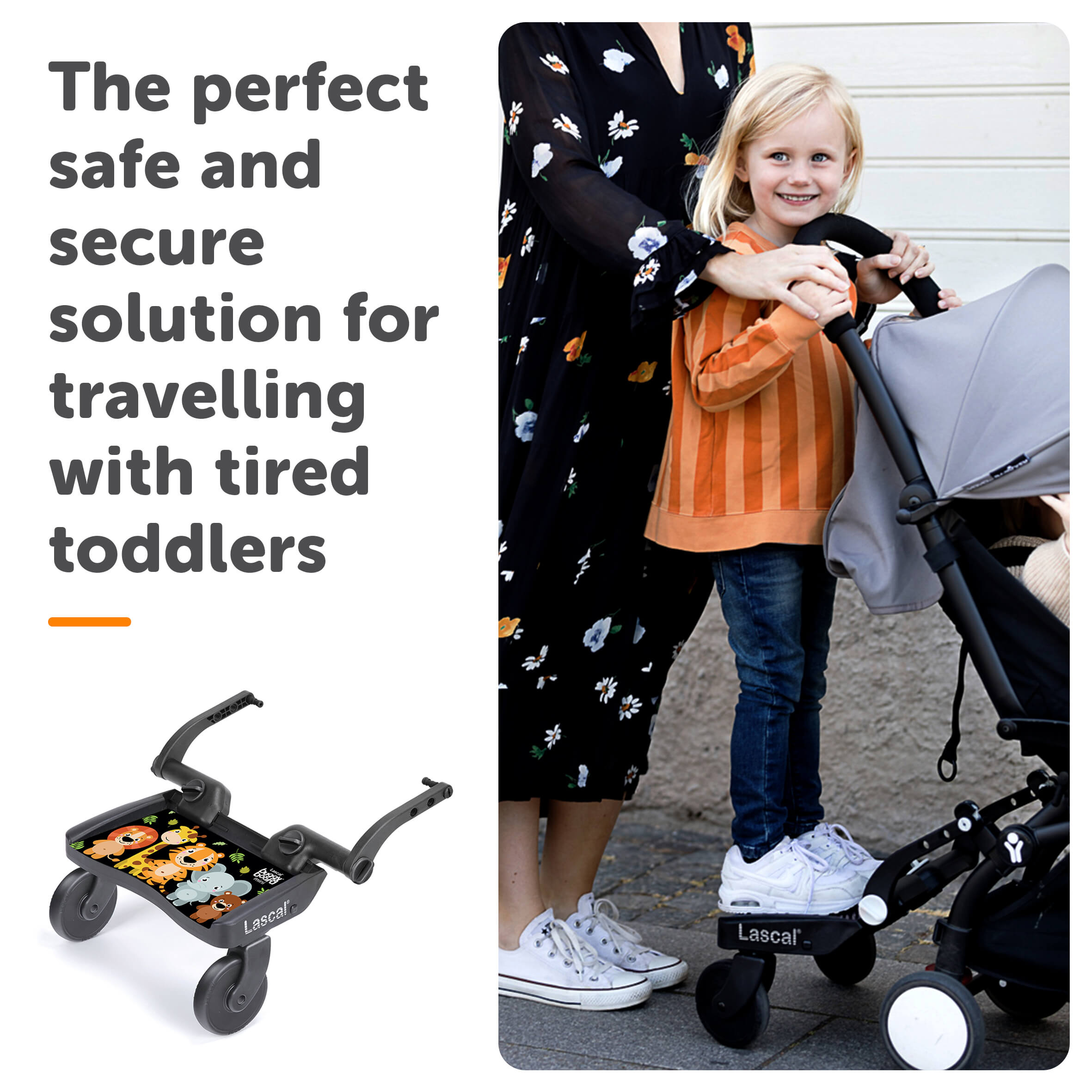 The original ride-on platform! The Lascal Mini BuggyBoard® provides a safe and practical solution for tired toddlers aged 2 – 5, offering secure attachment to most pushchairs and ensuring a comfortable ride on any terrain – no need for a double buggy!